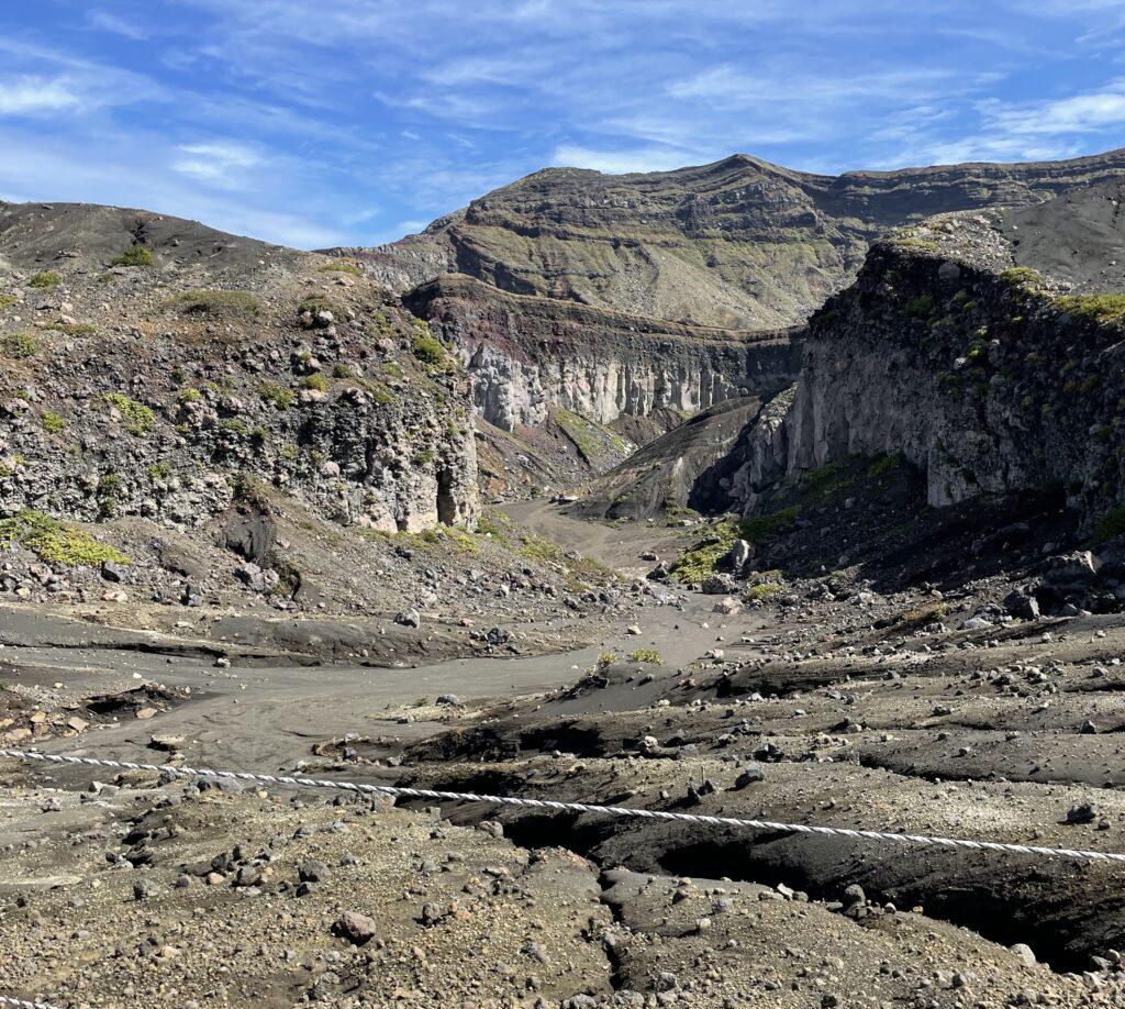 初めての場所だったのに、行ってみたい未知の世界に感じた。整備された歩道を進むと、中岳火口の裏側が見えてくる。先ほどのたて横入り混じった地層の裏側のよう。