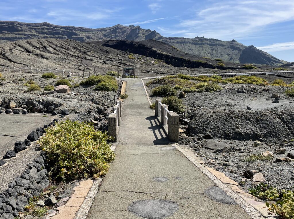中岳火口の駐車場から少し下ったところに、小さな駐車場があり、登山道につながる整備された白い歩道が見えたので、そこにも寄ってみた。意外と知られていないところなのか本当の登山道なのか、観光客は一組だけだった。